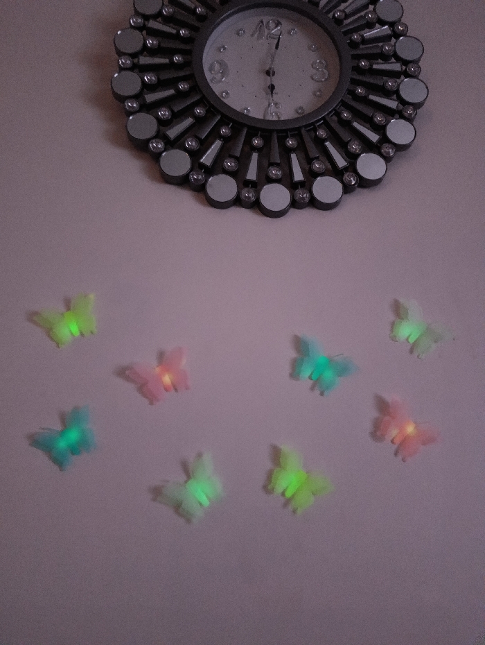 The image displays a light-colored interior wall in a room located in the city of Al-Qutaifa, Syria. Positioned in the upper center of the frame is a circular wall clock with a dark gray frame. The clock's decorative bezel features a radial arrangement of alternating circular and tapered mirrored segments, each accented with a small, clear jewel. The clock face contains Arabic numerals, with black hands indicating approximately 12:35. Below the clock, eight small, translucent, butterfly-shaped decorative lights are adhered to the wall in a scattered pattern. Three of these butterflies emit a light green glow, three emit a light blue glow, and two emit a light pink glow. The overall lighting of the scene is dim, enhancing the luminescence of the butterfly decorations. No individuals or active subjects are present.