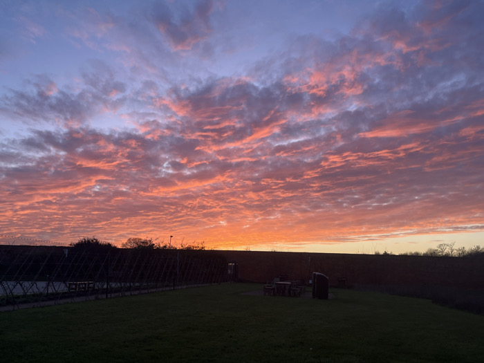 A vibrant sunset fills the sky with orange and pink clouds, fading into a blue-purple hue above. Below, a grassy area with a fence and some trees is visible. A picnic table sits on the grass, suggesting a park or recreational space. The scene captures a peaceful moment with nature's colorful display as the focal point.