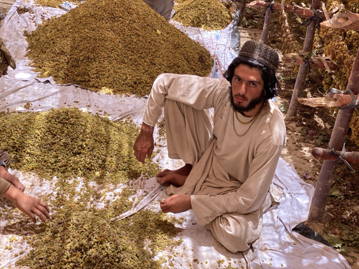The scene depicts an outdoor grape drying operation in Bazar-e Panjva'i, Afghanistan
