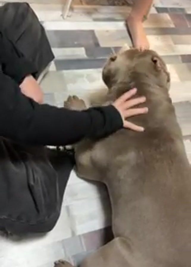 A young person wearing a black hooded sweatshirt is kneeling on a floor with a herringbone pattern. They are petting a large, light brown dog lying on its side. A second person is standing nearby, partially visible with bare feet. The child pets the dog's neck and back. Headphones are visible on the child's head. A partial view of a white chair can be seen in the background, and a couple of yellow objects are barely visible in the top left corner of the frame.