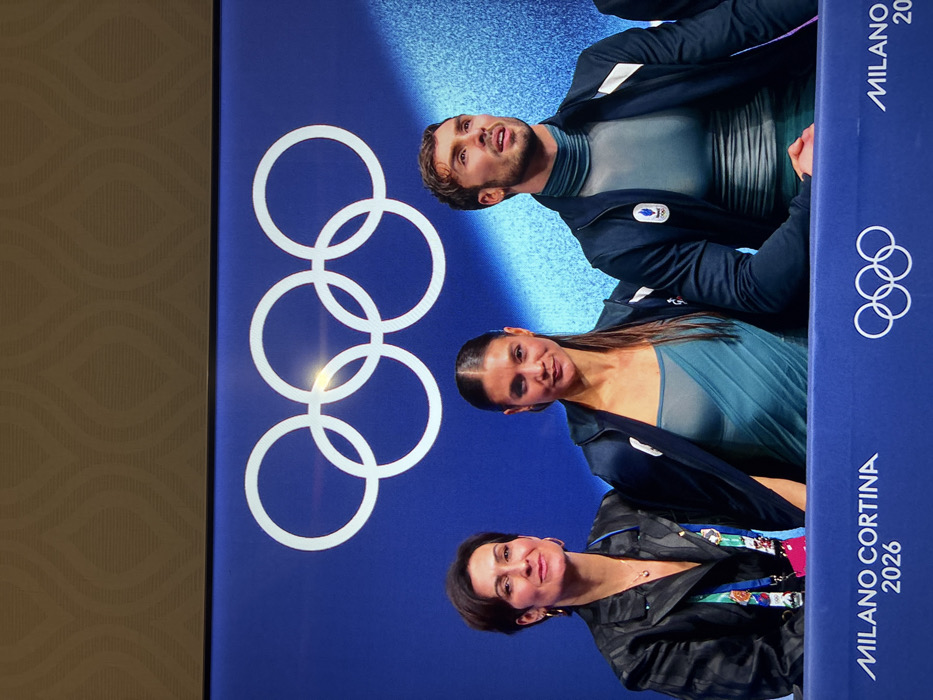 A TV screen displays an image featuring two athletes and a woman in dark clothing. The athletes are wearing matching athletic attire with Olympic rings visible in the background. The logo for Milano Cortina 2026 is also present on the screen. The scene appears to be an official or promotional event related to the upcoming Olympic games. The edge of the screen is visible on the left, showing a patterned wall.
