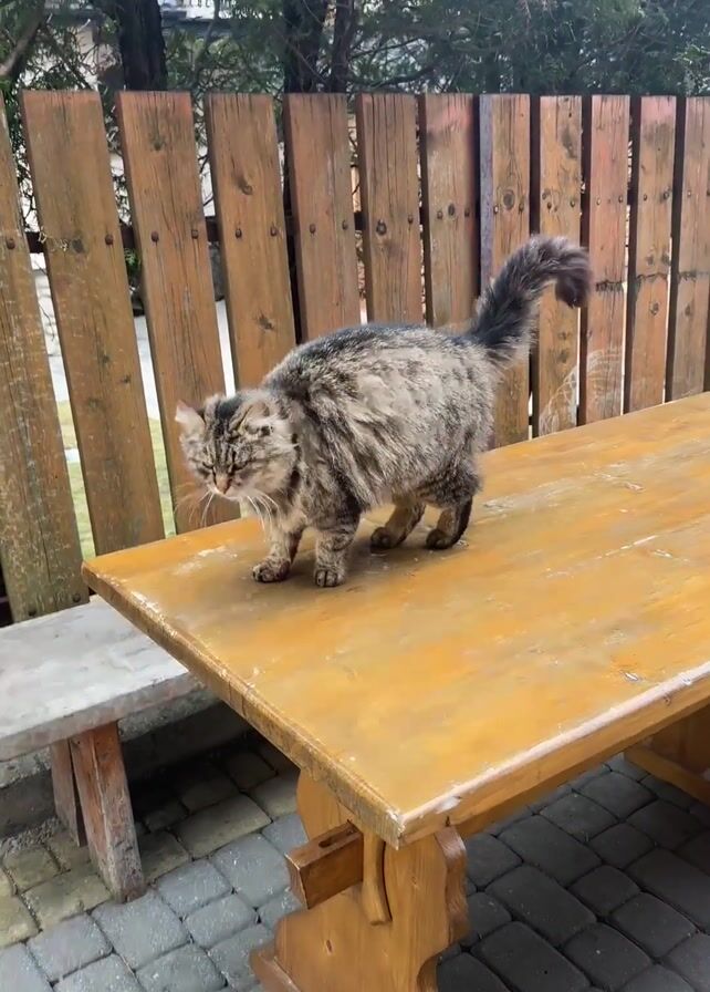 medium-sized brown and black tabby cat standing on a wooden picnic table in an outdoor setting