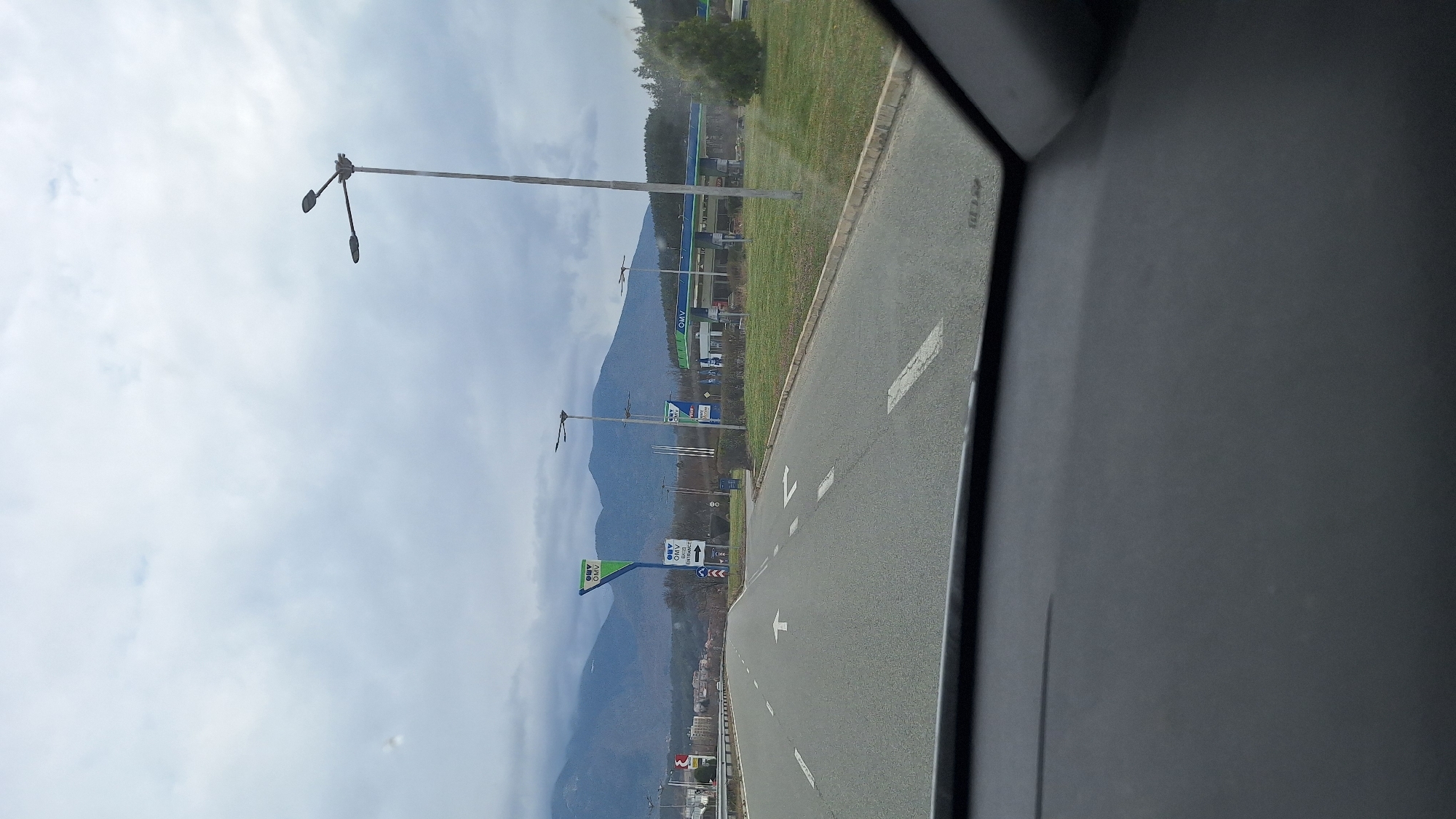 The image, captured from the interior of a vehicle with the dashboard visible in the lower foreground, depicts a multi-lane asphalt road extending towards distant mountains under an overcast sky with light grey clouds. The road features white painted markings, including a forward arrow and a left-turn arrow in the immediate foreground. To the right, a grassy median separates the road from a commercial area. Within this area, an OMV-branded gas station with a blue and green canopy covers multiple fuel pumps. Several streetlights with dual fixtures are positioned along the roadside and within the gas station property. A dense cluster of coniferous trees is visible beyond the gas station to the far right. On the left side of the road, a large vertical sign with "OMV" branding in blue and green, featuring additional text including "OMV ENTRANCE" and a right-arrow symbol, is present. Further in the distance on the left, at the base of the mountains, a cluster of buildings is discernible. No individuals or active vehicular traffic are explicitly visible in the scene beyond the perspective vehicle. The location is identified as a roadside area near a commercial establishment (OMV gas station) in the city of Unknown, Unknown, characterized by mountainous terrain in the background.