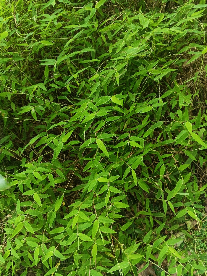 Lush green ground cover fills the frame. Small, pointed leaves sprout from slender stems, creating a dense mat. The leaves have a vibrant, healthy color. Scattered brown stems and a few bare patches of earth peek through the foliage, adding texture. The plants appear to be densely packed together, forming a thick carpet. A single white object is seen on the bottom left of the image.