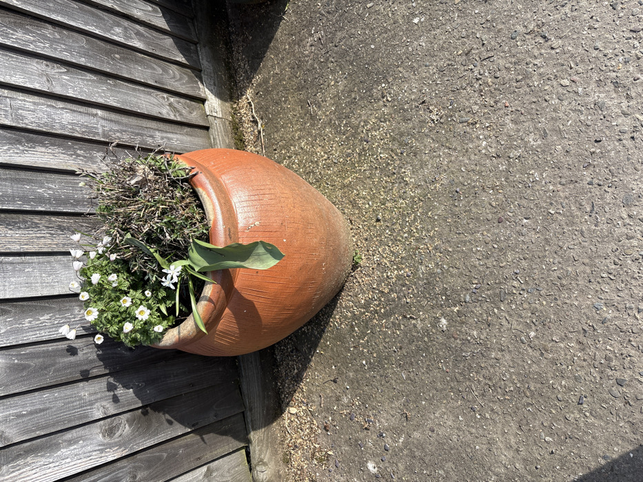 A large, reddish-brown, ribbed terracotta-style planter is centered on a coarse grey ground surface, located in Annscroft, United Kingdom. The planter contains two distinct plant groupings: a cluster of small white flowers with yellow centers and green foliage on the left, and a mass of dry, brown, skeletal plant matter on the right. A single white star-shaped flower with two green leaves, one significantly drooping, emerges from the center of the planter. Behind the planter, a dark, weathered wooden fence, constructed of vertical planks, serves as a backdrop. Strong directional sunlight from the left casts pronounced diagonal shadows from the fence planks onto both the fence surface and the adjacent ground. The ground transitions from a compact, pebbled grey material to a looser, lighter-colored gravelly aggregate near the base of the fence. No people or animals are present.