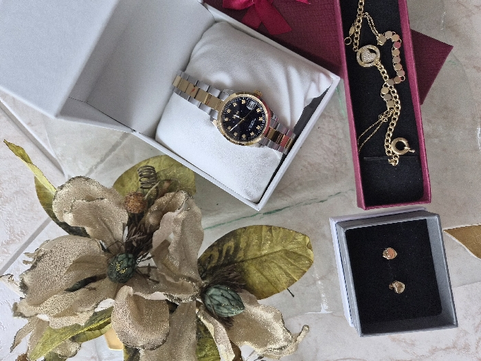 - "The scene depicts a collection of jewelry and a watch arranged on a light-colored, possibly tiled or marble-patterned surface" by FM-jvnrw2, licensed under CC BY 4.0