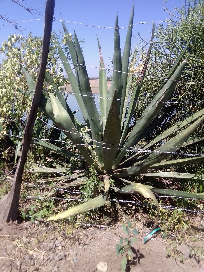 A large agave plant dominates the frame, its sharp, pointed leaves reaching upwards. It's partially obscured by a barbed wire fence. Behind the agave, a body of water is visible, possibly a lake or river, with vegetation on the far bank. A wooden post stands to the left of the agave. The foreground consists of dry, brown soil with small green plants scattered around. A small sapling grows near the base of the agave.