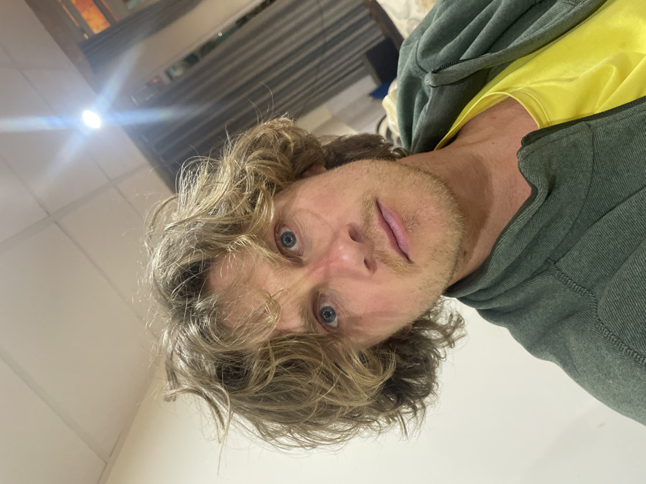 A male individual is depicted in a close-up, chest-up indoor photograph taken in Da Lat, Vietnam. The subject has light brown, wavy hair, blue eyes, and light facial stubble. A reddish mark is present on the bridge of his nose. He is wearing a bright yellow t-shirt beneath a dark green, unzipped, collared jacket. The background to the left consists of a plain white wall. The ceiling overhead is white with visible grid lines, featuring a bright, circular overhead light fixture that produces a lens flare in the upper right quadrant. To the right of the subject, a dark striped curtain is partially visible, obscuring a window or doorway, with indistinct warm-toned elements visible behind it. The individual is looking directly into the camera.