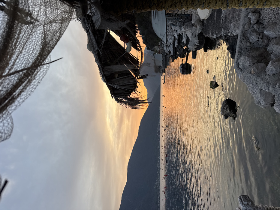 The image depicts a sunset scene over a calm body of water in Dražin Vrt, Montenegro, viewed from a rustic shoreline perspective. In the foreground, on the right, a rocky and partially paved shoreline abuts the water. Several dark, partially submerged rocks are visible in the immediate water near the shore. A dilapidated, open-sided structure with a thatched roof made of dried palm fronds or similar material extends from the right edge, casting a shadow. Above and partially draped over this roof, dark fishing nets are visible. Hanging beneath the thatched roof are two red and one white buoy. Further back on the shore, two inverted light-colored boats, possibly small dinghies, are stored on land. A thick, rope-wrapped column or support structure is present on the far right edge. The middle ground features a wide expanse of water reflecting the orange and yellow hues of the sunset. Numerous red and white buoys are scattered across the water, particularly in the left half of the frame, indicating aquaculture or a marked area. A small, light-colored boat or skiff is visible further out on the water towards the right, near the distant shoreline. In the background, dark, silhouetted mountains rise steeply from the water, framing the horizon. The sky transitions from a light blue-grey at the zenith to a vibrant orange and yellow glow near the horizon, with thin, scattered clouds. The sun itself is obscured by the mountains or has just set behind them, illuminating the western sky. No individuals are visible within the frame.