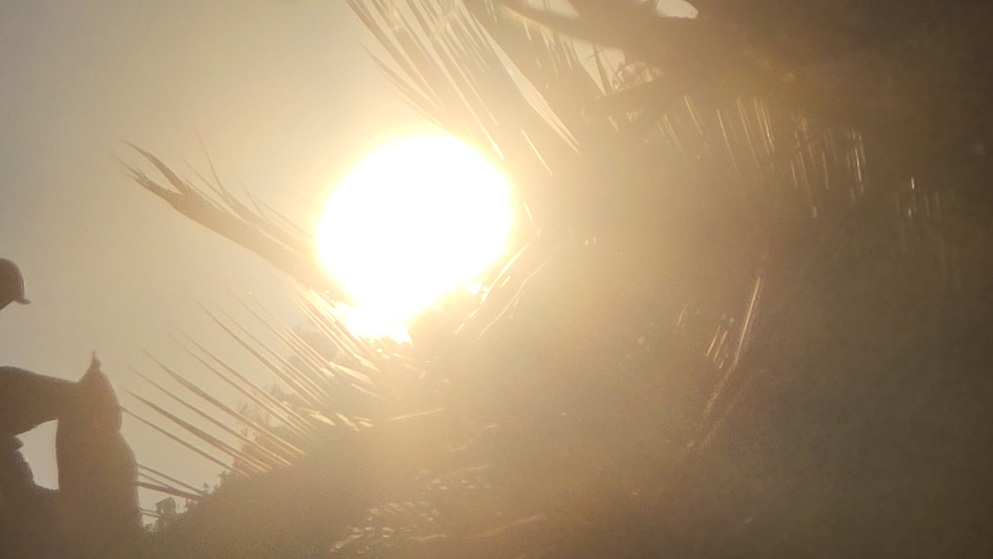 The image depicts a sunlit outdoor scene, possibly taken in the Bac Natural Heritage Area Trang, Vietnam. A person's silhouette is visible on the left side of the frame. Palm fronds and other foliage are prominent in the image. The sun is a bright focal point, appearing somewhat obscured by the foliage.