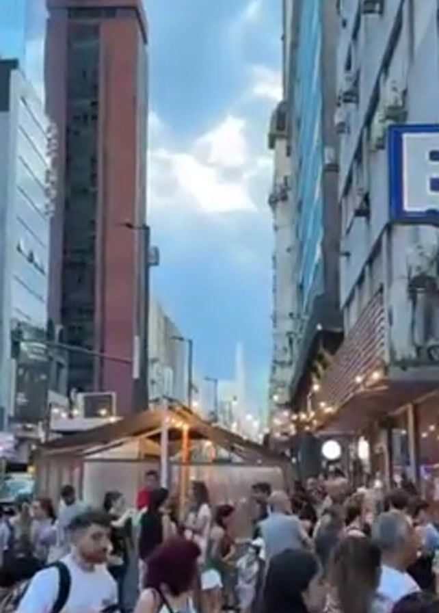 street scene in Buenos Aires, Argentina, crowded with people walking and gathering on the sidewalks
