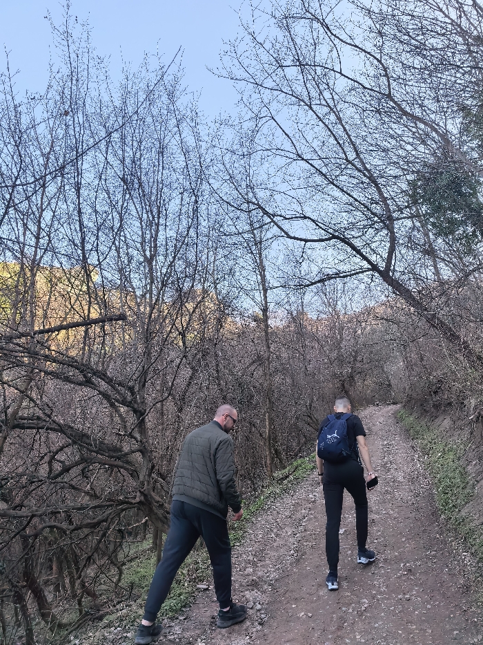 The image depicts two adult males walking uphill on an unpaved dirt path through a wooded area within the city of Brestovitsa, Bulgaria