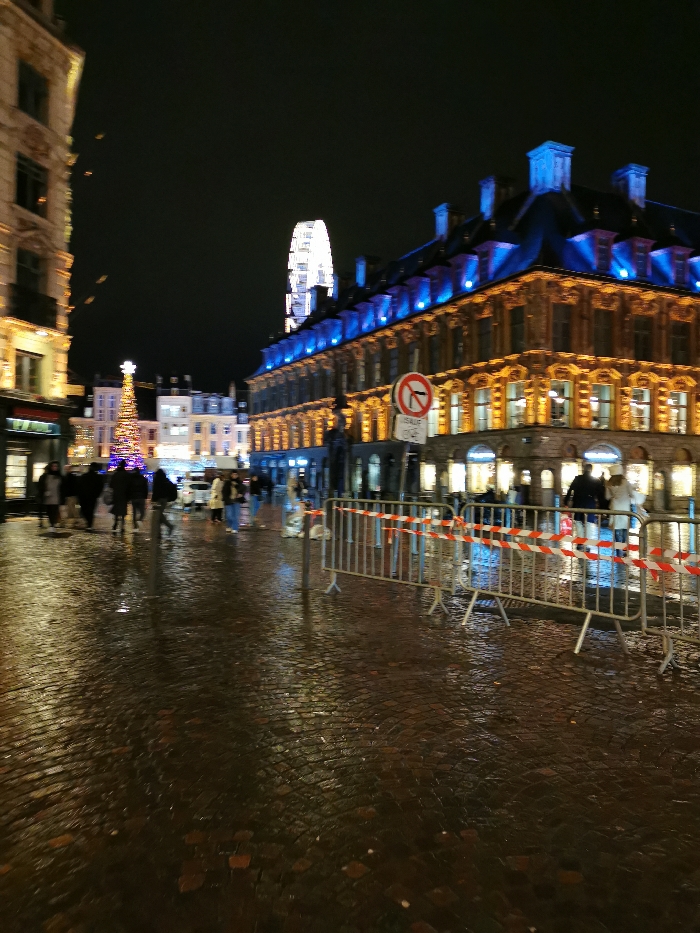 A European cityscape is captured at night, featuring illuminated buildings with ornate facades. A large Ferris wheel and a Christmas tree shimmer in the background. The scene includes pedestrians walking across a wet, cobblestone street. Metal barriers with red and white tape are visible in the foreground. Street lighting reflects off the wet pavement, enhancing the ambiance. A traffic sign is mounted nearby.