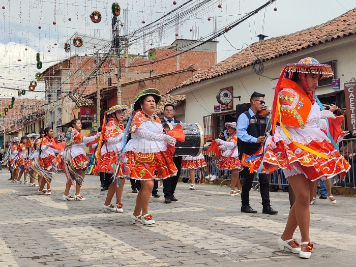 A parade moves along a cobblestone street lined with buildings. Dancers in colorful, traditional attire, including short skirts, hats, and decorative flourishes, fill the scene. Musicians playing instruments like the violin and drums accompany the procession. Wreaths strung overhead add a festive touch to the street. The sky is overcast, casting a soft light on the event.