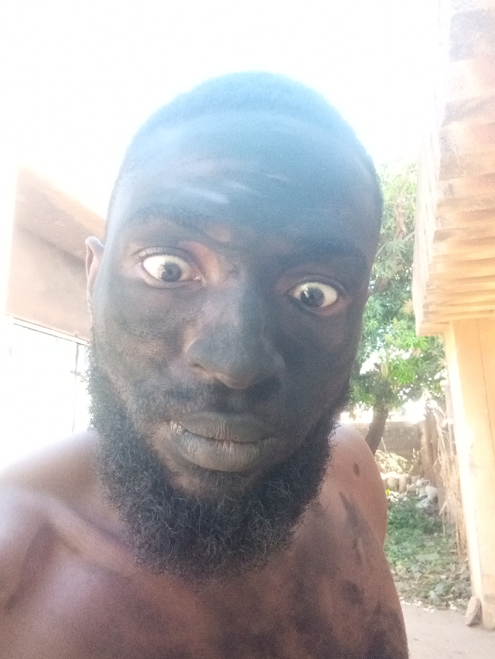 An outdoor close-up image, likely a selfie, taken in Sabon Tasha, Nigeria. The primary subject is an adult male with dark skin and a full, dark beard. His face, head, and visible upper torso are covered in a dark, grayish, uneven substance resembling ash or dried mud. His eyes are wide open, pupils dilated, and he stares directly at the camera. His lips are also coated in the same dark substance. The background on the left reveals a light-colored building or wall segment. On the right, a vertical section of a light-colored, possibly concrete or brick, structure is present, with green foliage and disturbed earth visible between it and the subject. The upper background is overexposed bright white, indicative of natural daylight.