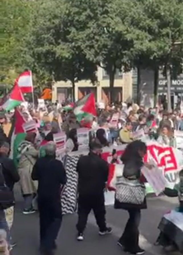 large crowd of people marching down a street in what appears to be a city. Many of the people are carrying Palestinian flags, and some are holding signs. The crowd appears to be protesting. There are trees on either side of the street, and buildings can be seen in the background. The weather appears to be sunny.
