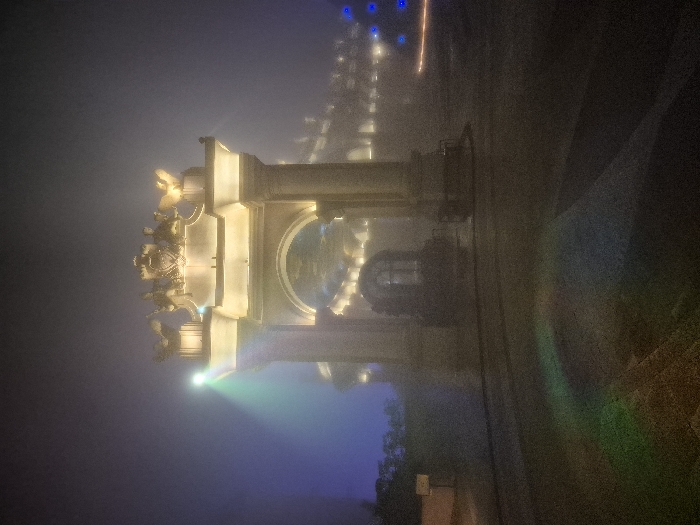 The image displays an ornate, classical-style archway illuminated at night within the French Village of Sun World Ba Na Hills, Đà Nẵng, Vietnam. The archway features four large columns supporting a decorative entablature, topped with sculptures depicting mythical creatures, possibly griffins, flanking a central crest. Warm yellow light emanates from fixtures illuminating the archway's structure. A prominent bright white light with a green hue projects upwards and diagonally left from the arch's upper-left corner, cutting through dense atmospheric fog that pervades the scene. The foreground consists of a dark, wet, paved surface, reflecting a distinct rainbow-like spectrum of colors in the lower-left. Through the archway, a dark, dome-shaped structure with a visible window is discernible. In the background, the blurred outlines of a large building complex are visible through the fog, illuminated by numerous warm lights, with additional scattered blue circular lights present on the right side of the frame. No individuals are depicted.