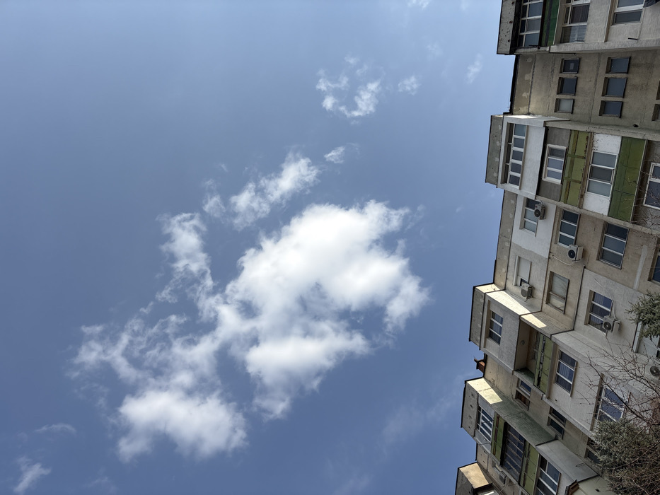 The image displays a multi-story residential building, likely a block of flats, situated in Montana, Bulgaria. The building's weathered facade consists of various shades of grey and white, with sections of faded green paneling on balconies. Numerous windows and multiple external air conditioning units are visible across its concrete or stucco exterior. The architectural style features protruding and recessed balconies, some enclosed. In the foreground, bare tree branches and some evergreen foliage partially obscure the lower portion of the structure. The upper two-thirds of the frame are dominated by a clear, bright blue sky containing scattered white cumulus clouds. No individuals, overt actions, or interactions are discernible. The scene is illuminated by natural daylight.