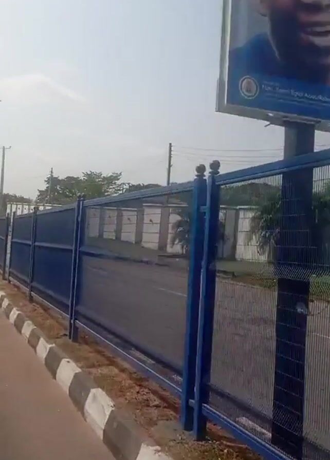 The video depicts a road with a black-and-white striped curb and a blue fence running along it. There are political billboards featuring images of men in the background. The first billboard says "Leadership Without Excuses" and the second one says "Kogi Must Unite." The video is shot from a moving vehicle. The sky is overcast, and the wind is blowing. There are buildings behind the fence and utility poles along the road.