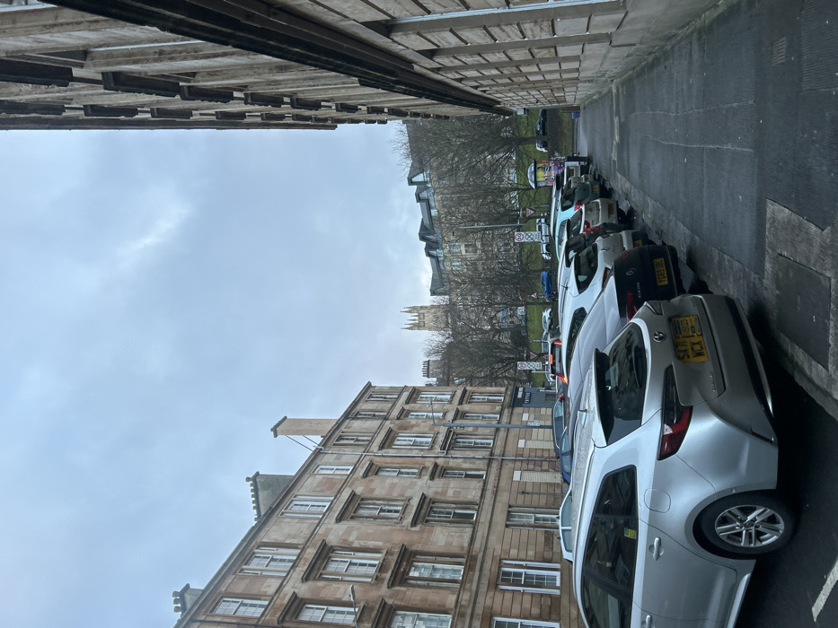 Cars line a city street on a cloudy day. On one side, a stone building with multiple windows rises high. In the distance, a church spire is visible amidst bare trees. A street sign is partially obscured by tree branches. The road is narrow with a sidewalk. Above, an overhanging architectural detail adds depth to the scene.