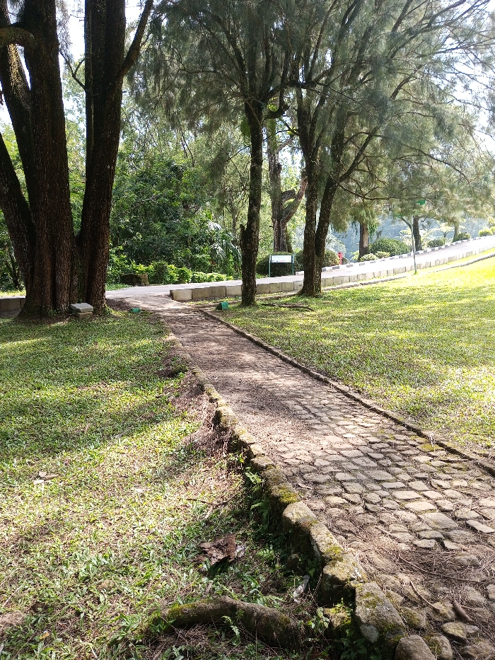 The scene depicts an outdoor park environment in New Serchhip, India, under clear daylight conditions. A narrow, irregular stone-paved path, approximately 1.5 meters wide, extends from the foreground into the midground, curving gently to the left. The path's left edge is delineated by a low stone curb, approximately 0.2 meters high, exhibiting moss growth and small plants. Green grass with scattered pine needles and dry leaves covers the ground on both sides of the path. Exposed tree roots are visible on the left side of the path in the foreground. In the midground, the stone path merges with a wider, darker paved surface. Several large trees with thick, dark trunks are positioned to the left of the path, while multiple tall, slender trees with lighter, possibly coniferous, foliage stand to the right. A rectangular green sign with white, unidentifiable text is situated in the midground, near the wider paved area, beneath the trees. The wider paved area on the right is bordered by a series of white concrete curb blocks and ascends uphill towards the right side of the frame. The background consists of dense green foliage and additional trees, indicating a forested or heavily vegetated area. No people or animals are present.