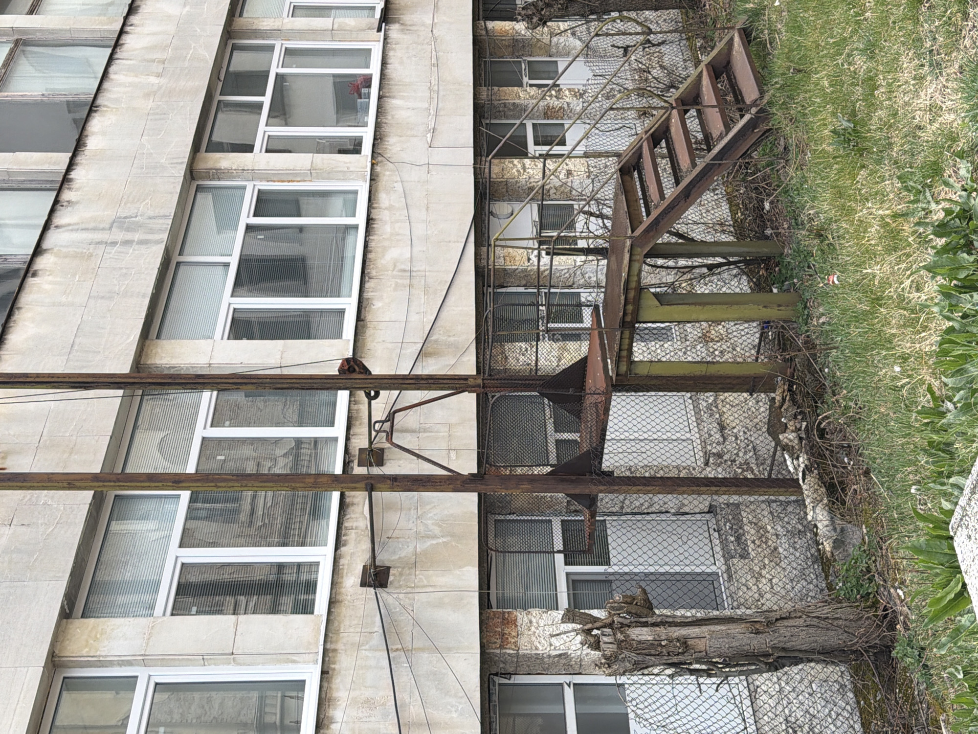 An exterior shot shows a weathered, multi-story building in Radomir, Bulgaria. The structure is characterized by rows of rectangular windows, divided into multiple panes and secured by white frames. Some windows are partially covered by blinds. A metal fire escape ladder runs vertically along the building's facade, adjacent to a chain-link fence that separates the building from a grassy area. The architecture reflects a utilitarian or functional design, indicative of industrial or institutional building types. Weathering and age are evident in the facade's materials.