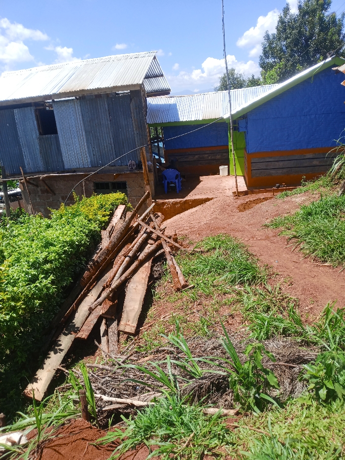 The scene depicts a rural or semi-rural setting in Kiangochi, Kenya, under a clear blue sky with scattered white clouds. The foreground consists of red-brown earth and patches of green grass and weeds. To the left, a large pile of assorted wooden planks and logs rests on the ground, adjacent to dense green shrubbery. In the mid-ground, two primary structures are visible. The building on the left is a multi-story dwelling with a lower section constructed from grey concrete blocks and an upper section clad in corrugated metal sheeting, featuring an open, unglazed window. A pair of light-colored sandals are placed on a wooden support beam beneath the upper story. A thin, light-colored wire or string extends from this building towards the center. To the right, a single-story building is painted with an upper blue section, an orange horizontal stripe, and a lower section with grey horizontal lines. It has a green door. Both buildings are topped with corrugated metal roofs. A covered walkway or open-air common area connects or is situated between these two structures. Within this area, a blue plastic chair is positioned, and a faint human figure appears to be seated in it. A white bucket rests near the green door of the right building. A tall, slender pole, possibly a utility pole or antenna mast, stands upright in the center of the image. The background features lush green trees and distant hills under the same blue sky. The ground leading up to the buildings is an unpaved red-brown dirt path.