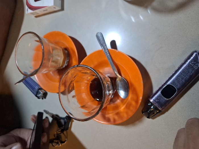 The image presents a close-up, overhead view of a table in Lhokseumawe, Indonesia. Two clear glass cups rest on bright orange saucers. The foreground cup contains a dark liquid, approximately one-quarter full, with a silver-colored spoon on its saucer. The background cup is mostly empty, showing light brown residue at its bottom. A blue disposable lighter is positioned behind the background cup. A purple, metallic-textured vape device with a black mouthpiece and central button lies horizontally on the table in the bottom center. In the upper left quadrant, a hand holds a black smartphone, next to which a set of keys with a dark keyring is placed on the table. A white and red cigarette box is partially visible in the upper right. The scene suggests a casual gathering or break time.