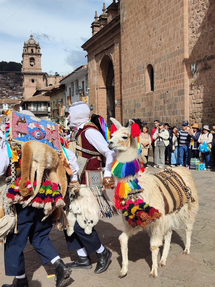 - "A person in a white mask and traditional clothing walks beside a llama adorned with a colorful rainbow fringe and ornate saddle" by FM-20kwN2, licensed under CC BY 4.0
