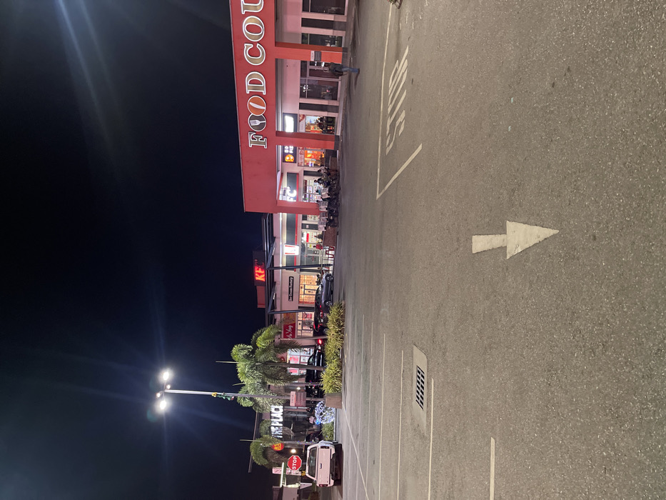 At night, a brightly lit fast-food complex featuring "Food Court" and "KFC" signs is visible