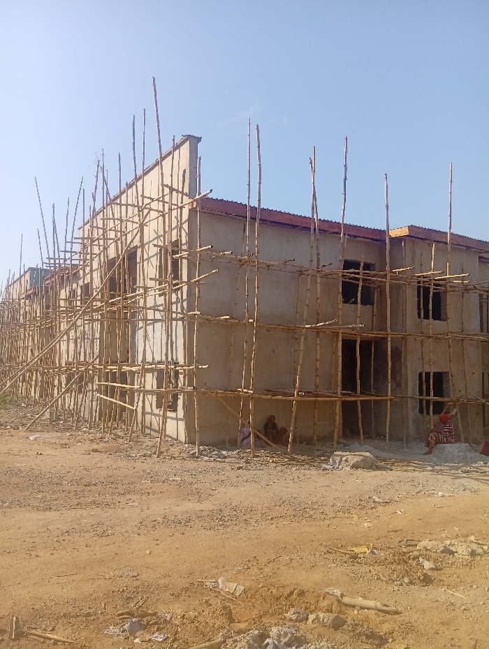 An unfinished two-story building is under construction, surrounded by a network of bamboo scaffolding