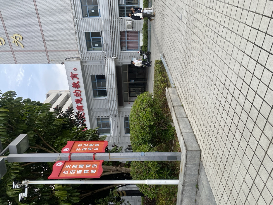 The image features a building with a sign that reads "Satisfactory Education." There are two red signs with white text, one reading "Keep in mind the mission, never forget the original intention" and the other "Always listen to the Party, devote yourself to the Party." The building appears to be a school or government facility. Several people are walking near the entrance. The scene is captured from a slightly tilted perspective, with trees and bushes framing the building.