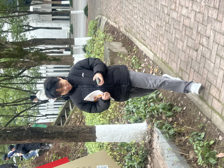 A young man in a black puffer jacket and gray pants stands on a brick path. He holds a leaflet in one hand and a cell phone in the other, appearing to examine the leaflet. A building and trees line the background, with some of the tree trunks painted white. Ground cover plants grow beside the walkway. The overall scene suggests the man is on a campus or in a park-like setting.