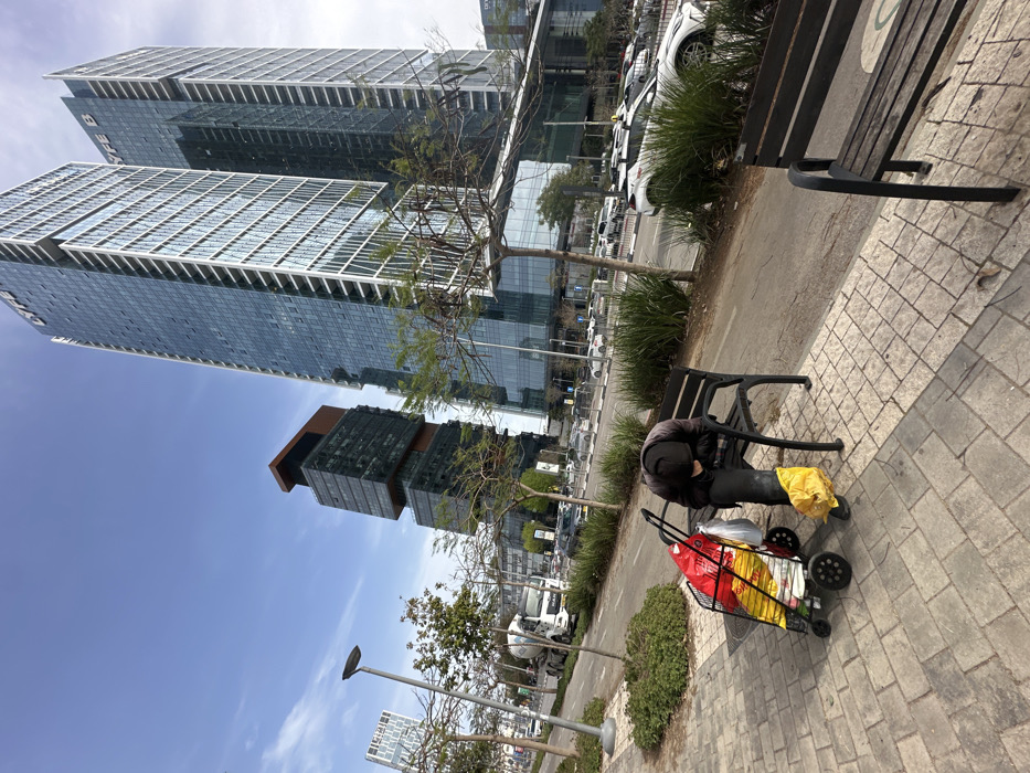 The image depicts an urban scene in the Bnei Brak Business Center (BBC) along Jabotinsky Road in Bnei Brak, Israel. In the foreground, a single individual is seated on a dark metal and wooden slatted public bench, leaning forward with their head bowed, obscured by a dark hood or cap, suggesting rest or sleep. They are dressed in dark clothing. To their immediate left, a black four-wheeled shopping trolley holds multiple brightly colored plastic bags, predominantly red and yellow. Another yellow plastic bag rests on the paved surface near the person's feet. The ground consists of light-colored rectangular paving stones. Beyond the pedestrian area, a narrow dirt path and a landscaped median strip with small trees and green shrubbery separate it from a multi-lane road. The road contains vehicular traffic, including several cars, a white MAN brand cement mixer truck, and white taxis with yellow roof markings. In the mid-to-background, towering modern skyscrapers dominate the skyline under a clear blue sky. Two prominent glass-facade towers, one distinctly labeled "LYFE B" vertically on its side, stand tall to the right. To their left, another uniquely designed, darker-toned building features stacked, cantilevered sections. Further left in the distance, additional high-rise structures are visible. A streetlight is positioned in the left midground.