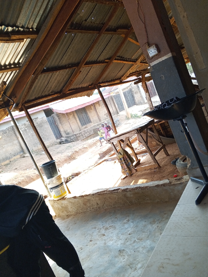 The image depicts a semi-outdoor, open-sided structure, possibly a veranda or market stall, overlooking a residential dirt street in the city of Unknown, Unknown. The overhead structure consists of a rusty, corrugated metal roof supported by weathered wooden beams. The immediate foreground features a concrete floor with a raised concrete ledge extending across the lower portion of the frame. To the far left, the back and shoulder of an individual wearing a dark jacket with white stripes are visible. Against the concrete ledge, a black bucket is stacked atop a white bucket with yellow markings. A rickety wooden table stands in the mid-ground, with a multi-colored patterned fabric hanging from it. To the right, a dark, large, bowl-shaped object, possibly a cooking pot or brazier, rests on a black metal stand and contains a white and black patterned fabric. Adjacent to this stand is a dark-colored vertical pillar featuring a white electrical outlet with visible wiring. On the ground near the wooden table, a woven basket and a discarded tire are visible. Beyond the structure, a sunlit dirt path or street is present. Three individuals, appearing to be children, are visible on this path. One child wears a pink outfit, another wears a light-colored top, and a third is partially obscured. They are standing or moving on the dirt path. In the background, several single-story buildings constructed from light-colored concrete blocks with red or brown corrugated roofs line the street. These buildings exhibit visible windows and doors, and the surrounding ground appears unpaved and dusty. The scene is illuminated by bright daylight.