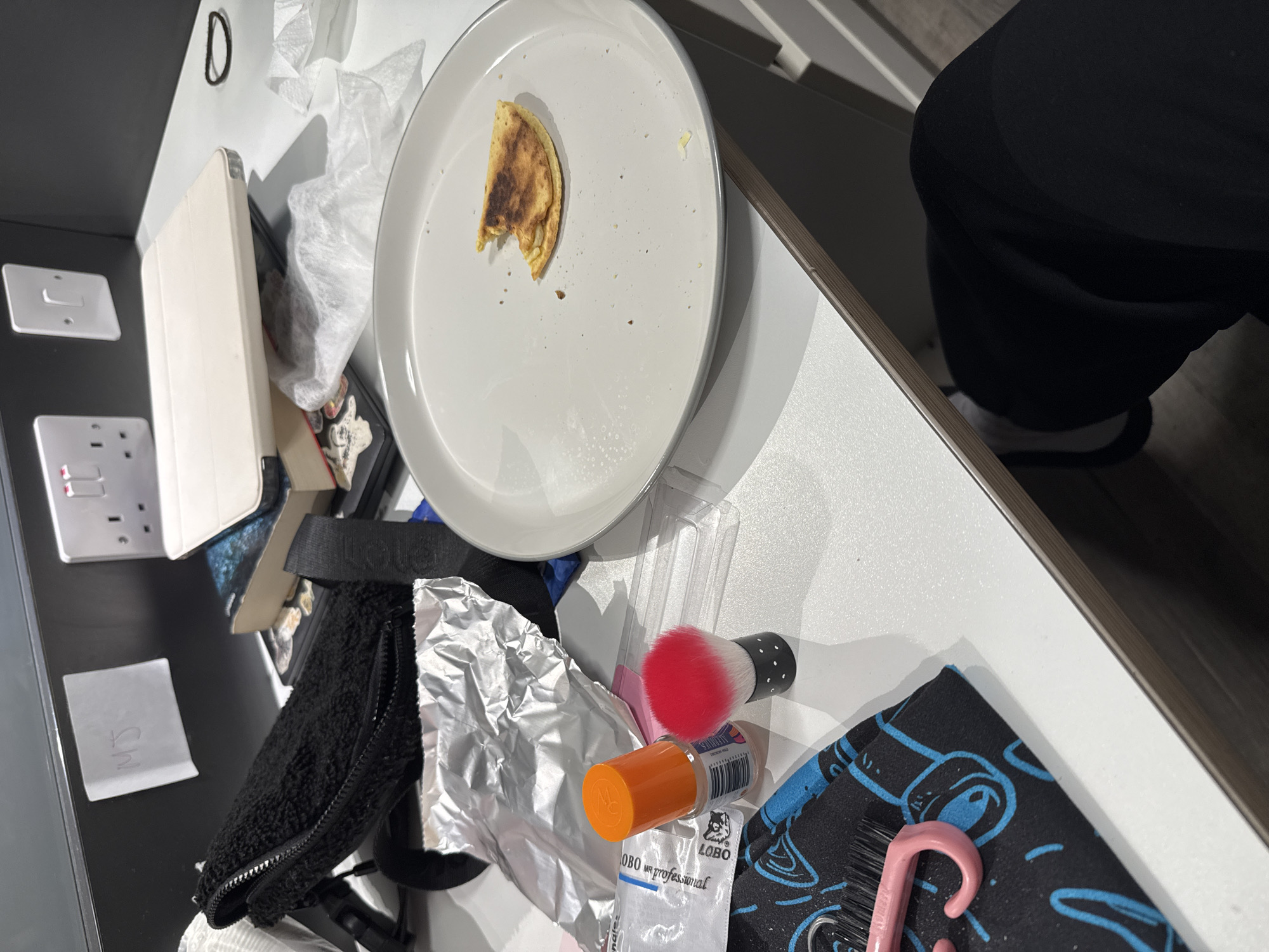 The scene depicts a cluttered white desk surface within a room, likely student accommodation, in the city of Hull, United Kingdom. The desk is positioned against a dark grey back panel featuring two white British-style double electrical sockets with red switches and an additional single white switch plate. A small white sticky note bearing the handwritten initials 'MJ' is affixed to the back panel. On the desk, from left to right, a partially visible white pillow or cushion is positioned behind a black, textured zippered pouch with a strap. Below this pouch, a crumpled piece of silver foil rests next to a clear plastic bag containing a white packet, possibly a cosmetic product, with the word 'LOBO' visible. An orange-capped bottle, likely nail polish, stands beside a small makeup brush featuring a red and pink gradient head and a black, polka-dotted handle. To the lower left, a folded black fabric item with blue patterns displays a pink hair clip or comb. In the center, a stack of books, including one with a red spine and another with a dark blue/purple cover, supports a light-colored tablet case or stand. Adjacent to these, crumpled white tissue paper is present. A round, light grey plate occupies the center-right, holding a single, partially consumed, folded food item resembling a small pancake or tortilla, with visible browning and crumbs scattered across the plate. A black hair tie or elastic band is located on the far right of the desk. A person, seated at the desk, is indicated by the presence of a leg clad in black trousers or leggings, with a portion of a white sock visible beneath the desk on the lower right side of the frame.