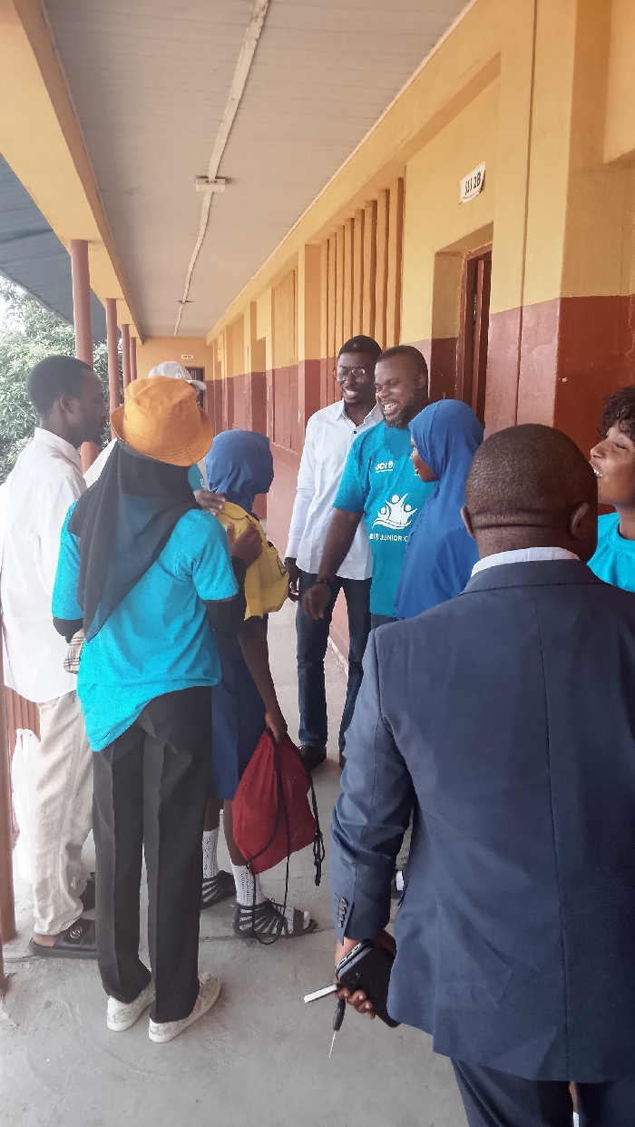 group of people standing in a hallway, likely a school hallway, in Street, Nigeria