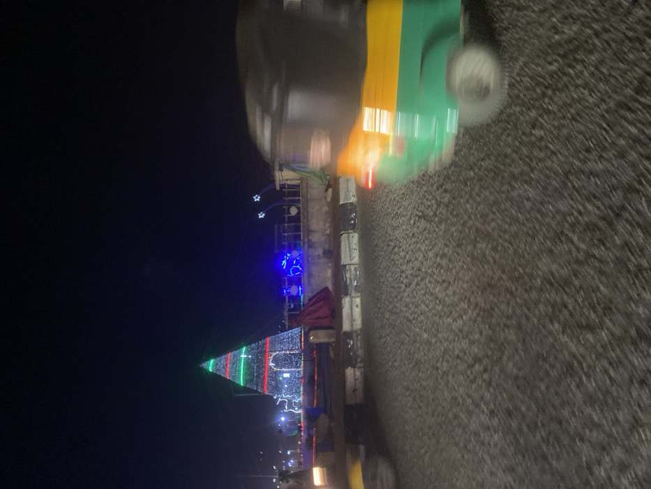 A night scene captures a Christmas tree outlined with lights, standing tall against the dark sky. Next to it, a structure is adorned with blue lights and star-shaped illuminations. A blurred auto-rickshaw passes by. The ground appears to be paved, adding a sense of urban atmosphere.