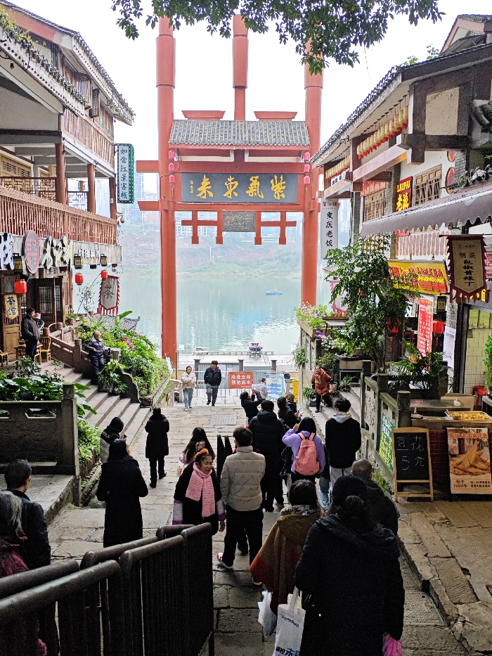 An urban street scene showcases a bustling walkway lined with traditional Chinese buildings. Pedestrians stroll down the stone path towards a red ornamental gate that frames a waterfront view. Shops and eateries with vibrant signage flank the path, their open facades displaying goods and enticing customers. A sign displays "豆花 5元", likely indicating a local dish for sale at five yuan. The scene captures a vibrant blend of culture and commerce.
