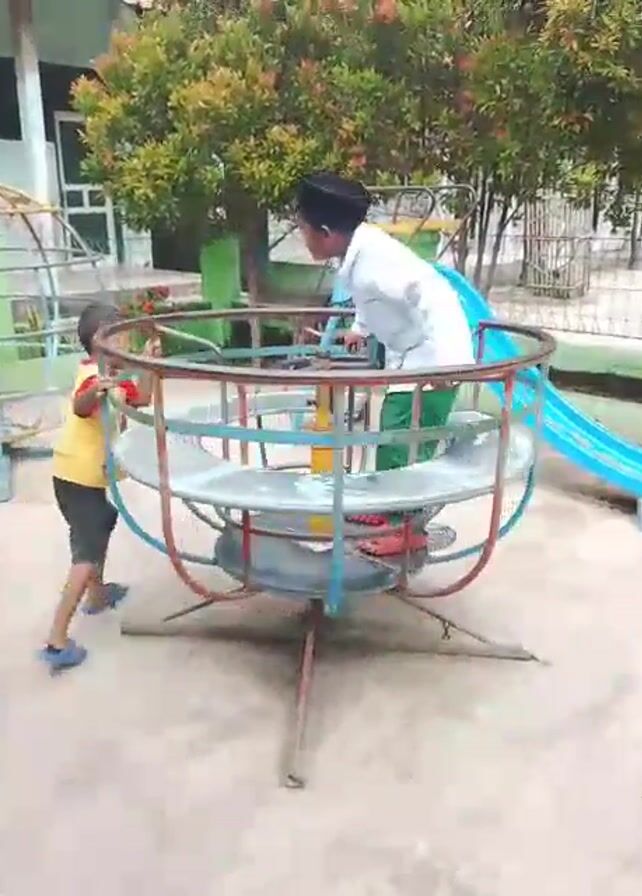 - "A young boy wearing a yellow shirt, black shorts, and blue sandals is pushing a small merry-go-round at a playground" by FM-bXIMf1, licensed under CC BY 4.0
