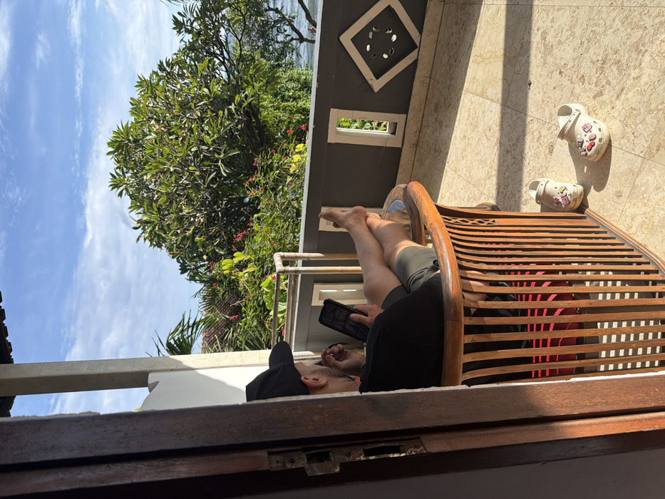 A man reclines in a wooden chair on a tiled balcony, legs crossed, engrossed in a tablet. A pair of white Crocs sit nearby. Lush greenery and a bright blue sky fill the background. A section of a dark wooden frame is visible at the bottom of the image. A section of a building is visible, with a square geometric design near the top.