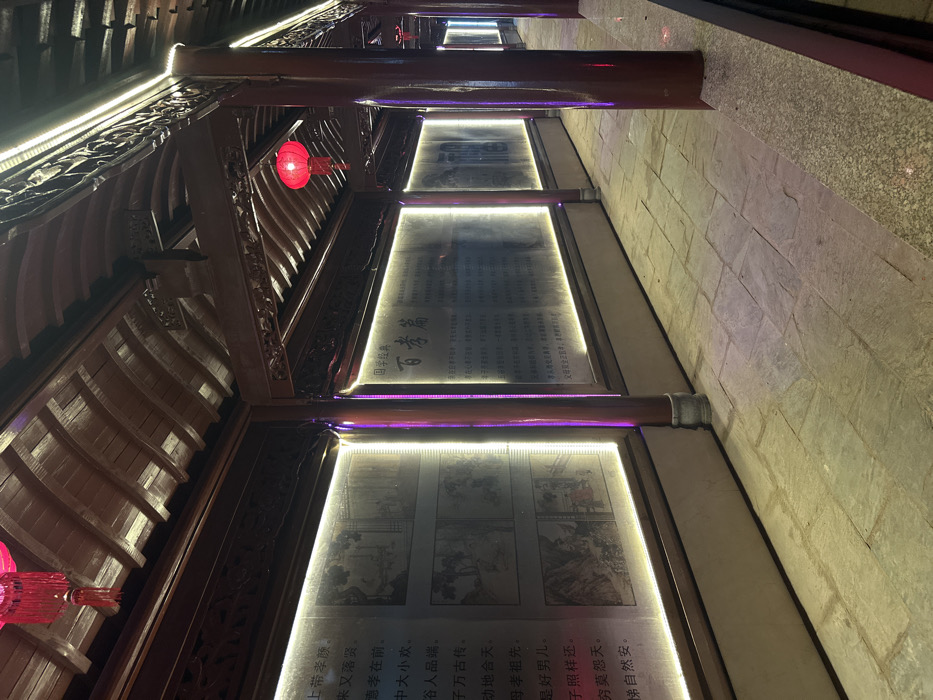 A covered wooden walkway in Wengang, China, illuminated at night. The pathway features a stone-paved floor and dark reddish-brown wooden pillars supporting a curved, beamed ceiling. Along the left wall, multiple rectangular display panels are present, each bordered by bright white LED strip lighting. These panels contain Chinese text and black-and-white line art illustrations; one panel title reads "百孝篇" (Bai Xiao Pian). Traditional red Chinese lanterns with tassels hang at intervals from the ceiling, which is also lit by overhead strip lighting. No individuals are visible. Artificial lighting casts reflections, including purple hues, on the wooden pillars.