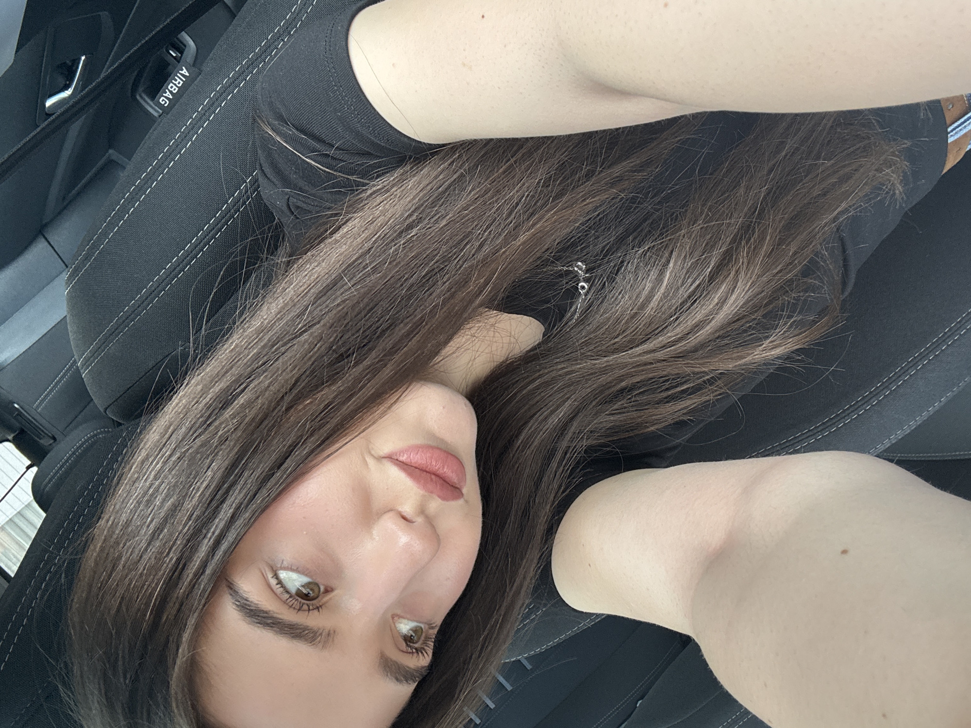 A female subject is depicted in a close-up, angled selfie taken within the interior of a vehicle in Unknown, Unknown