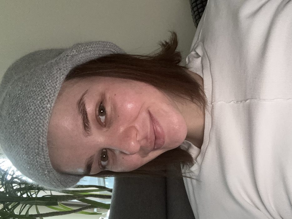 The image features a young adult female captured in a close-up, chest-up portrait. She has light skin, brown hair styled above the shoulders, and dark eyes, looking directly at the camera with a subtle, closed-mouth smile. Her forehead, nose, and cheeks exhibit a slight sheen. She is wearing a light gray knitted beret adorned with small, reflective elements, and a white, ribbed long-sleeved top with a prominent vertical seam down the front. The background suggests an indoor, domestic setting, with a dark gray upholstered item visible on the left and a tall, green leafy houseplant positioned near a window on the upper left. The lighting is soft and ambient. The scene is located in Warsaw, Poland.