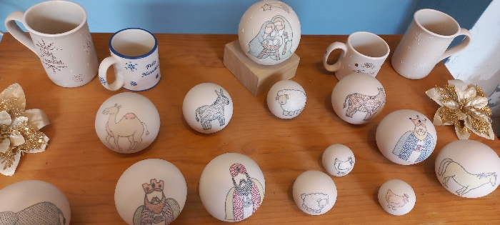 A wooden surface holds an assortment of decorative items. Mugs with Christmas-themed writing and snowflake patterns stand beside spherical ornaments adorned with illustrations of the Nativity scene, including figures of Mary, Joseph, the three kings, a camel, a donkey, sheep, and a horse. Two golden flowers add a decorative touch.