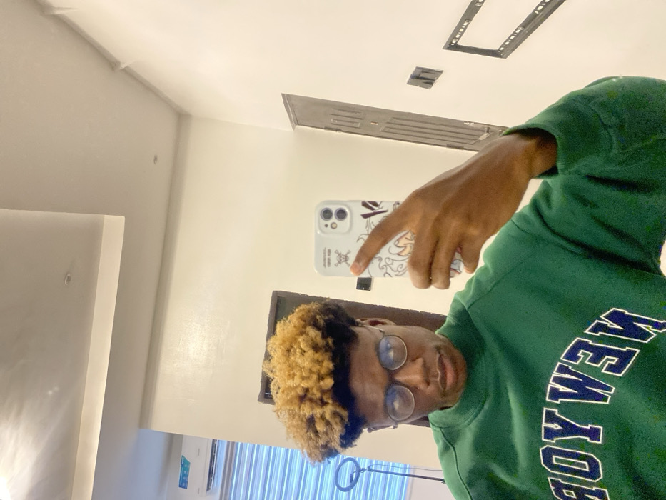 A male individual is depicted taking a mirror selfie indoors in Igboefon, Nigeria. The subject, with dark skin, features bleached blonde/light brown tightly curled hair with darker roots and wears round, dark-framed glasses. He is dressed in a green long-sleeved sweatshirt bearing the reversed text "NEW YORK" in dark blue and white lettering. His right hand holds a white smartphone, equipped with a case adorned with a skull and crossbones emblem and other graphics, positioned to capture the reflection. The immediate environment reflected in the mirror consists of light-colored walls and a white ceiling with recessed lighting and a square panel. To the left, a window with horizontal blinds and a wall-mounted air conditioning unit are visible, alongside a partially obscured black ring light on a stand. To the right, a dark-colored door frame and another dark rectangular panel or door are present.