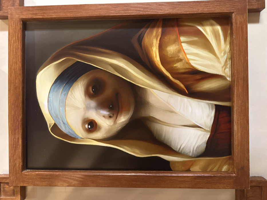 A framed portrait-style artwork depicts an anthropomorphic sloth rendered in the iconic pose and attire of Johannes Vermeer's "Girl with a Pearl Earring