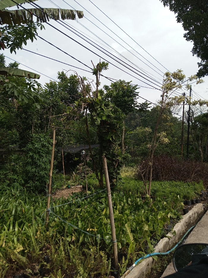 The image displays an outdoor plant nursery or garden section located in Kandenuwara, Sri Lanka, beneath an overcast sky. The foreground features various potted plants, predominantly ferns and broad-leafed specimens in black cultivation bags, arranged on the ground. Two vertical wooden poles, possibly bamboo, are interconnected with light blue rope, forming a support structure. A climbing plant with large, green leaves is trained up one of these poles. Behind the central plant arrangement, a dark mesh or tarp is visible, indicating a shaded cultivation area. A concrete curb runs along the lower right, defining the edge of the plant area, with a blue hose resting on it. A partial reflection, consistent with a vehicle mirror, is visible in the bottom right corner. The background consists of dense tropical foliage, including trees with both dark green and lighter, variegated leaves. Multiple utility poles and numerous power lines are visible spanning the sky horizontally across the upper portion of the frame. No individuals are present.