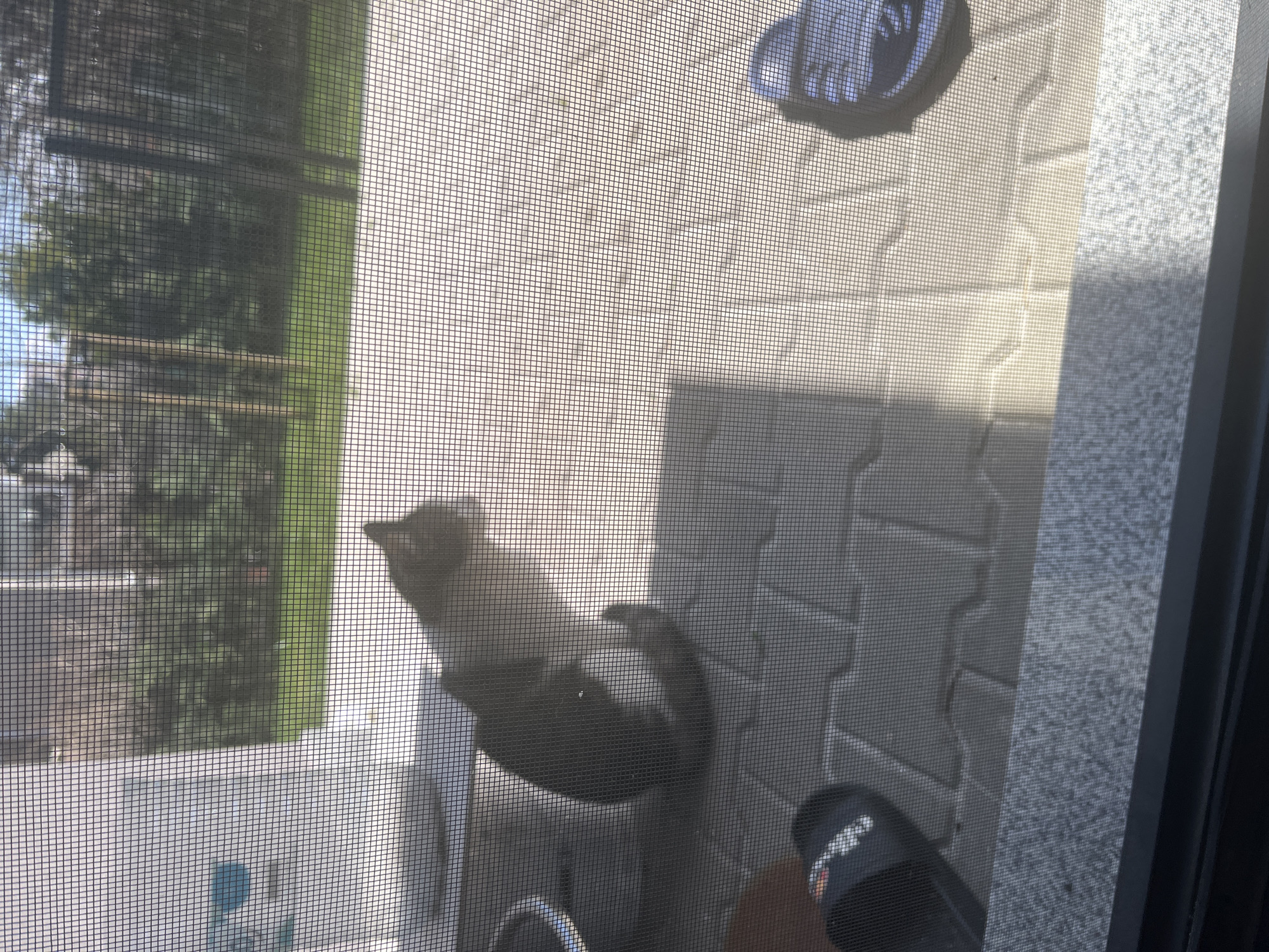 A bird is perched on a window screen, seemingly outside a building. The screen obscures the view, but trees and buildings are visible beyond it. A brick exterior can be seen to the right of the bird. A shoe and sandal are also visible at the bottom of the image. The location is unspecified and cannot be confirmed as Sofia, Bulgaria based on the image alone.