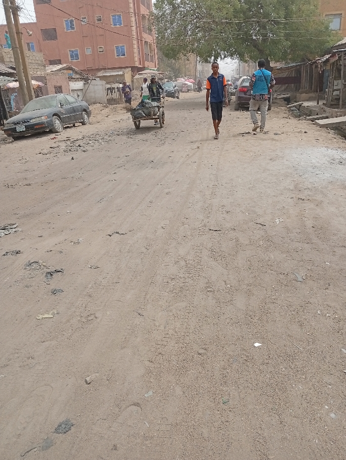 The scene depicts an unpaved, dusty street in Sabon Gari West, Nigeria, under daylight conditions